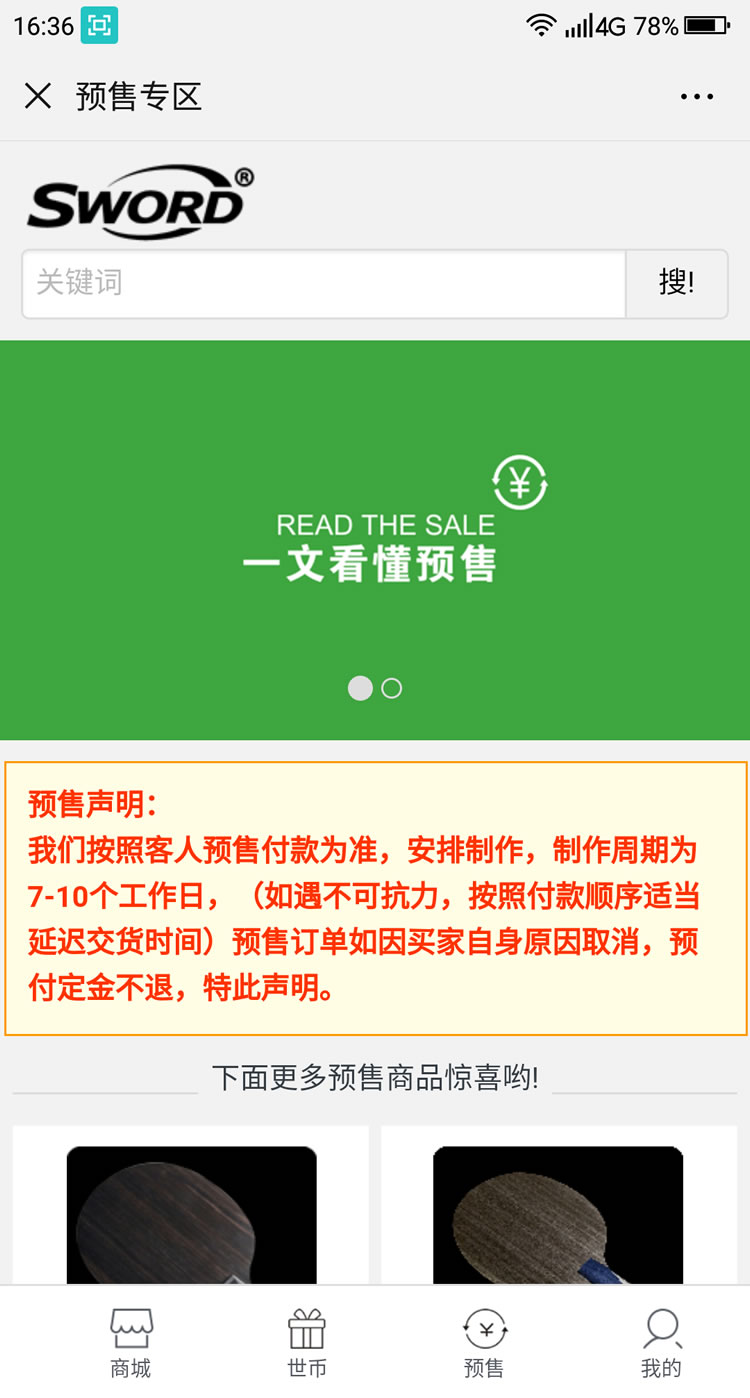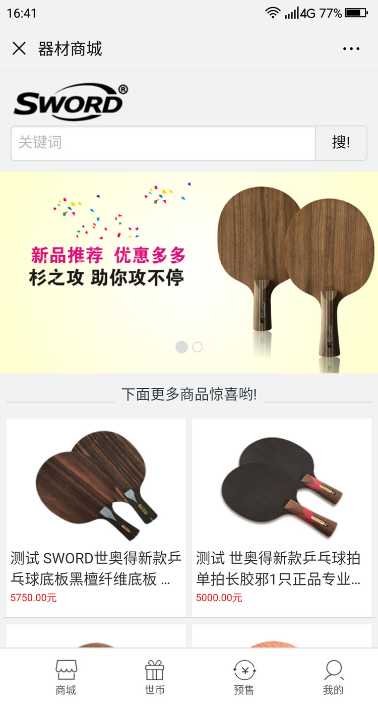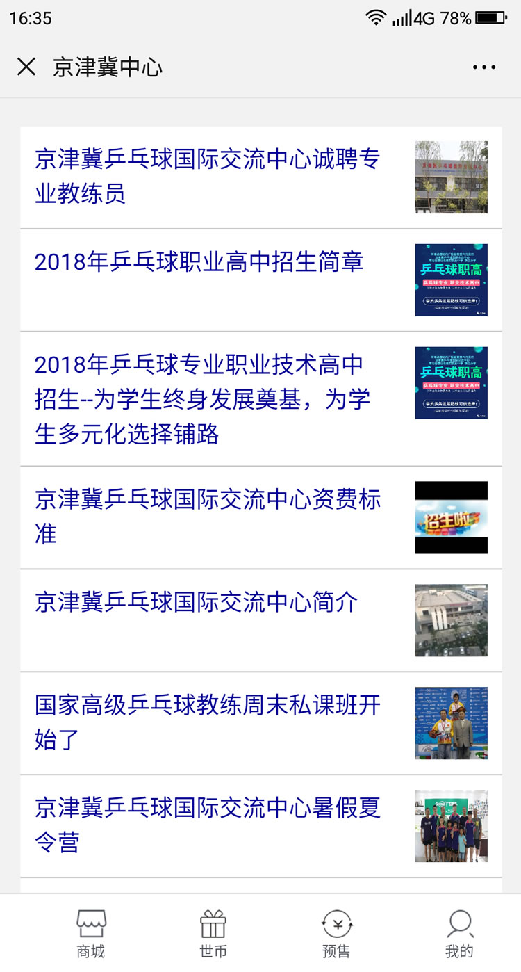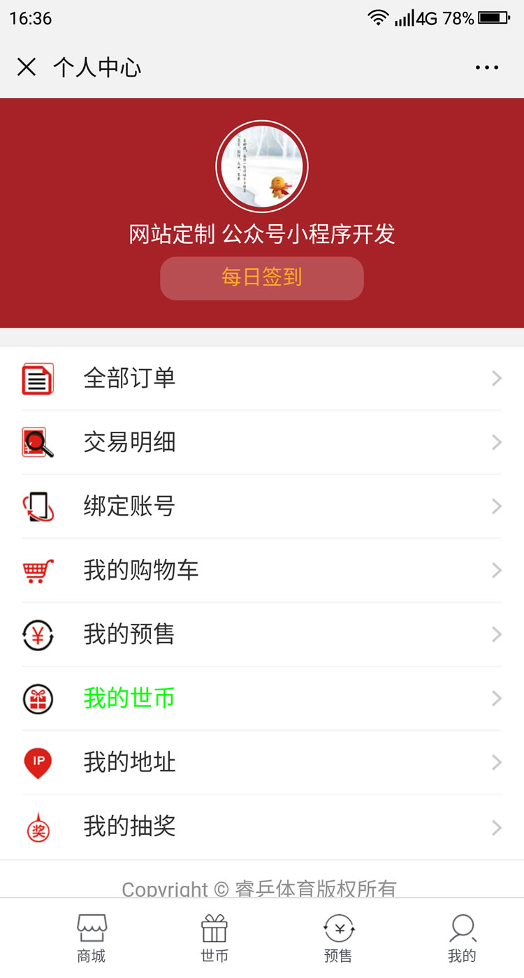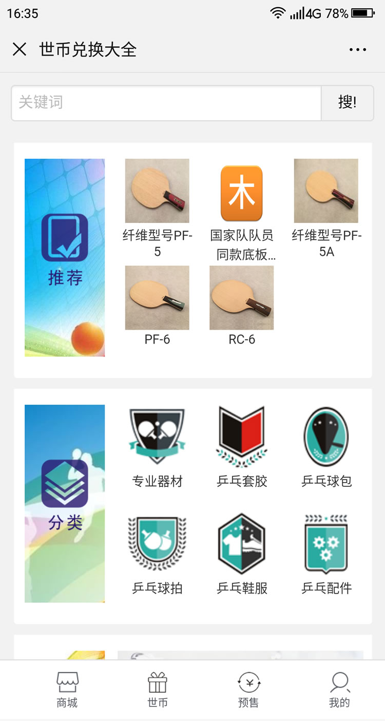 睿乒体育公众号平台-主要功能:器材商城、预售、定制、报名、证书查询、世币商城、福利中心、睿币商城、世币抽奖,签到等功能。